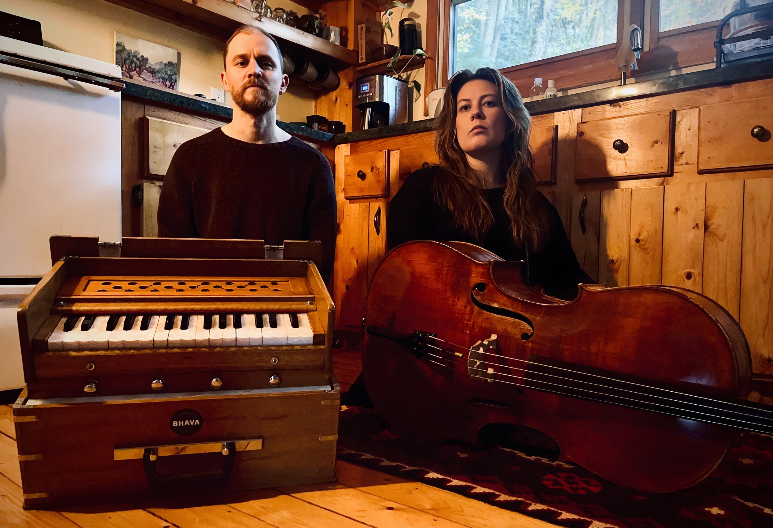 Okapi is an avant-folk duo that typically employs upright bass and cello, but has recently taken an alternative compositional approach using harmonium, cello, and voice to explore a contemporary interpretation of Appalachian-style murder ballad themes and other folk music elements, forming unique original pieces that thematically confront the complex relationship between man and the divine feminine of nature.